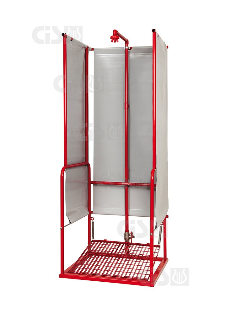 Doccia di emergenza box con pedana ad azionamento a pedale. Dotata di robusta struttura in acciaio zincato e paratie in tessuto gommato. Raccordi in ottone. Il tutto è verniciato epossidico anticorrosivo. Speciale testata in ottone verniciata epossidico, getto triangolare elicoidale ottenuto tramite speciale dispositivo interno. Tutti i comandi sono collegati a valvole a sfera ispezionabili e estraibili per una perfetta manutenzione, che rimangono aperte in fase di utilizzo. Tutte le docce sono fornite con apposita insegna conforme alla normativa. Pressione acqua richiesta: minimo 2 bar. portata acqua: 30 l/min. per testata singola. Disponibile in colore rosso,verde e giallo